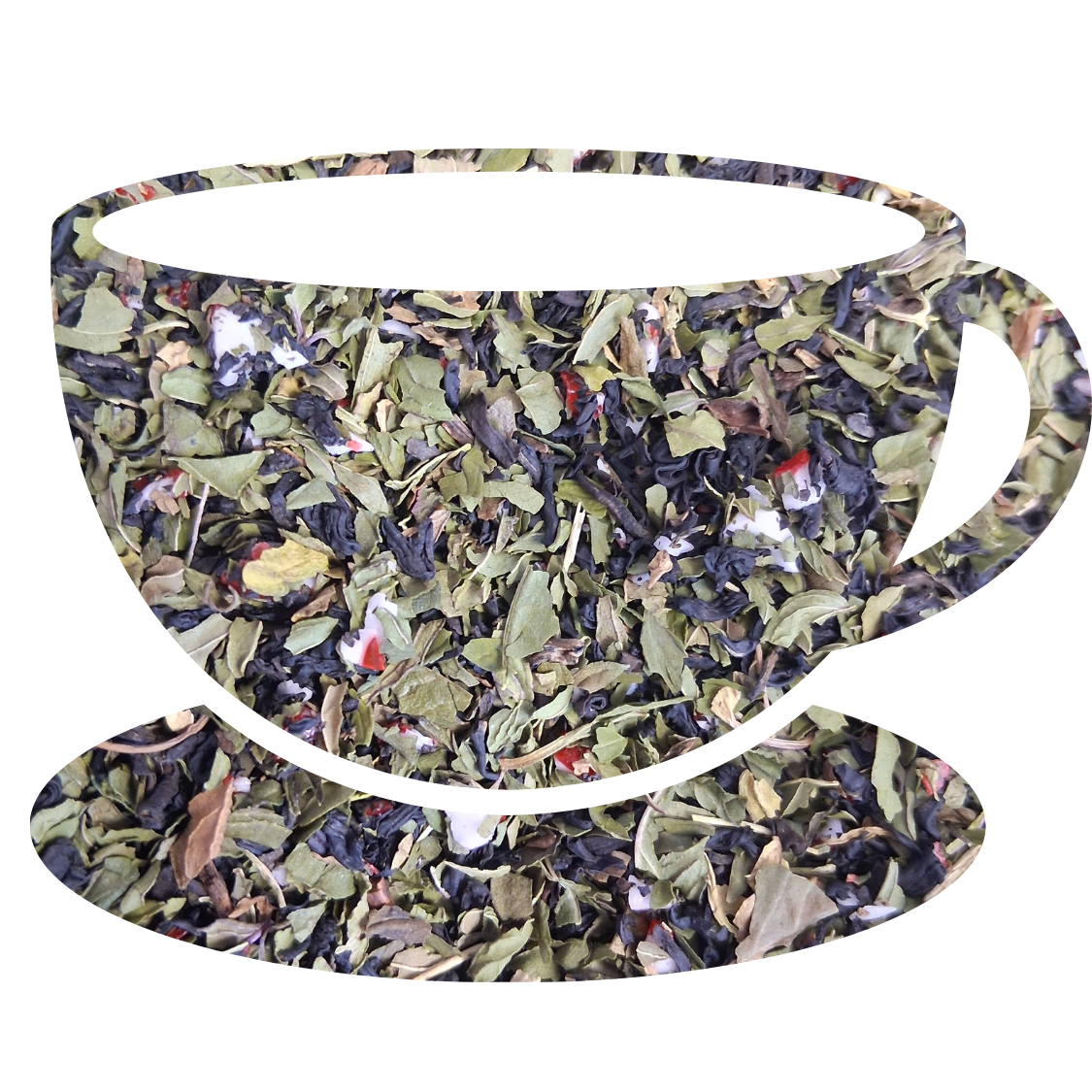 Decaf black tea, natural vanilla flavor & peppermint with candy canes pieces.