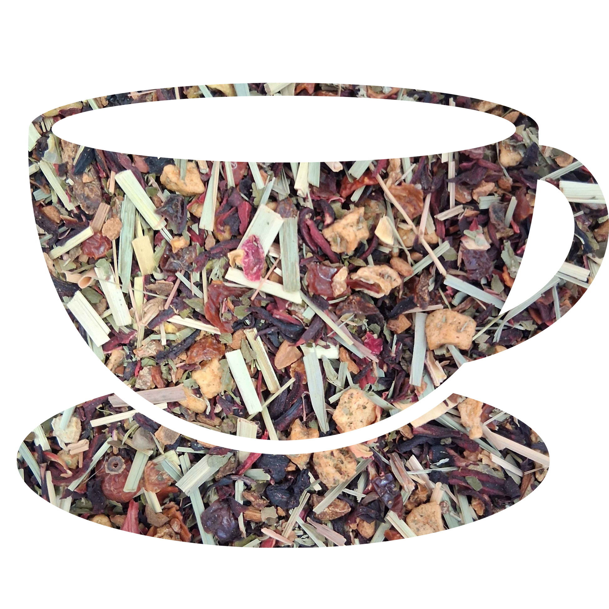 Hibiscus, cinnamon, rose hips, apple pieces, lemon grass, orange, raspberry leaves, natural passionfruit flavor, peach pieces, rose petals, mango pieces